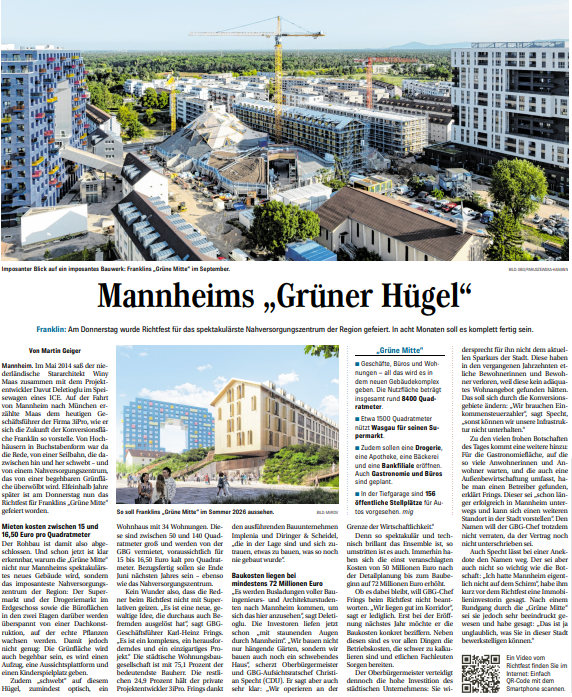 Am 23. Oktober wurde das Richtfest für Franklins spektakulärstes Bauprojekt gefeiert: die „Grüne Mitte“, entworfen vom renommierten Architekturbüro MVRDV. Unter einem begehbaren, begrünten Hügel entstehen ein Supermarkt, eine Drogerie, Gastronomie, Büros und Wohnungen – ein Meilenstein nachhaltiger Stadtentwicklung in Mannheim.