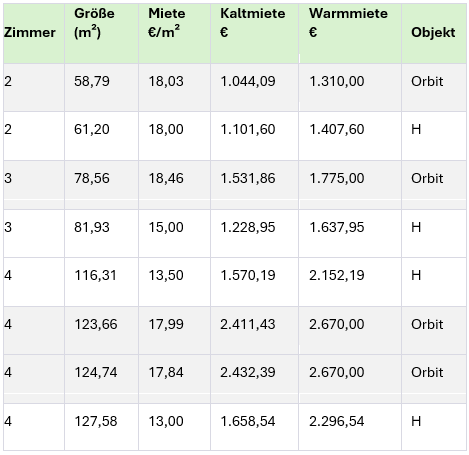 Hier eine Zusammenfassung der aktuellen Mieten für verschiedene Wohnungstypen: